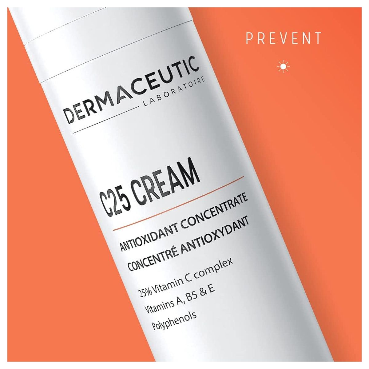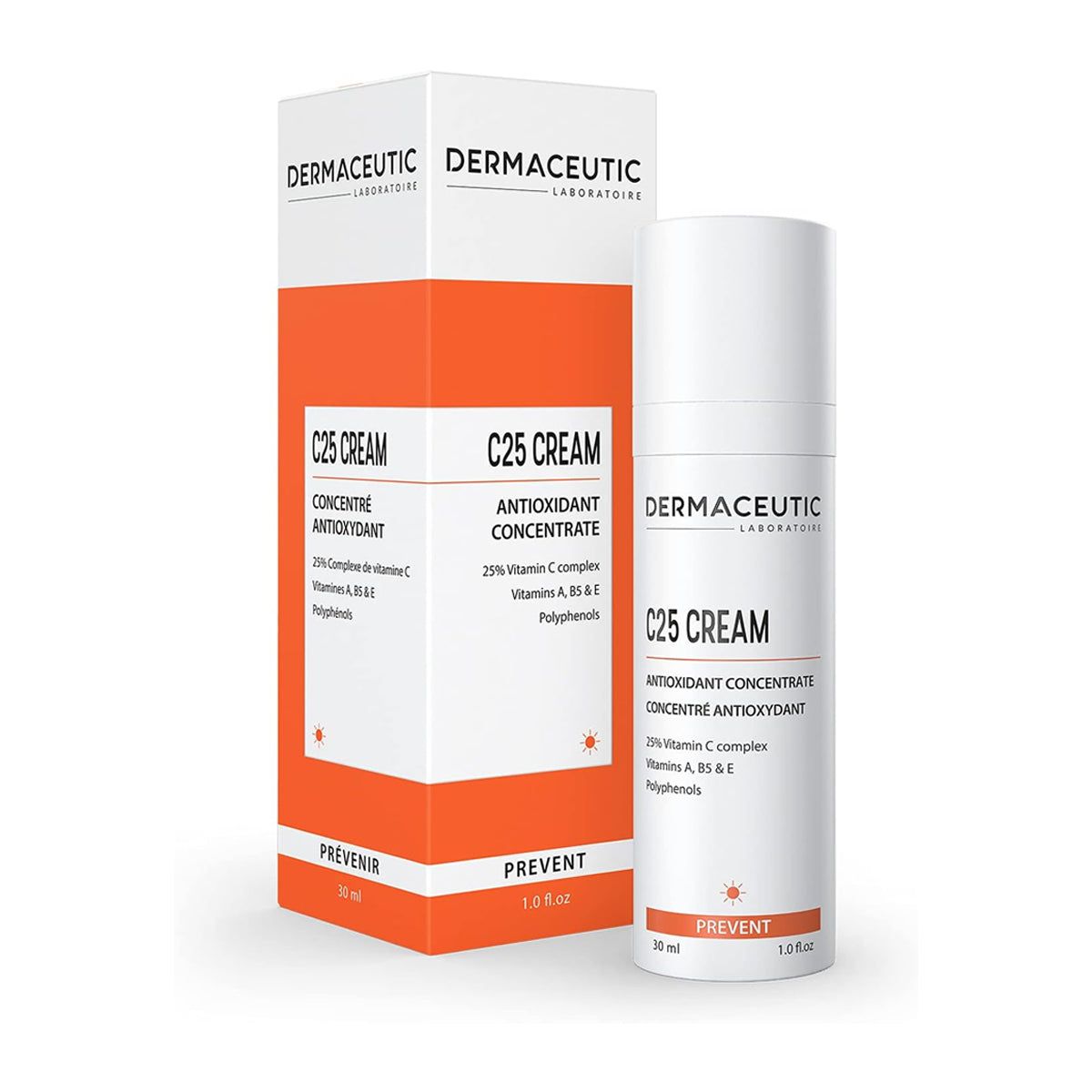 كريم ديرماسيوتيك سي ٢٥ المُركّز المُضاد للأكسدة، ٣٠ مل، يمنع ظهور أضرار الجذور الحرة وعلامات شيخوخة البشرة المُبكرة بفضل تركيبته القوية المُضادة للأكسدة. يُعادل تآزر فيتامينات ج، أ، ب٥، وهـ تأثير الإجهاد التأكسدي.